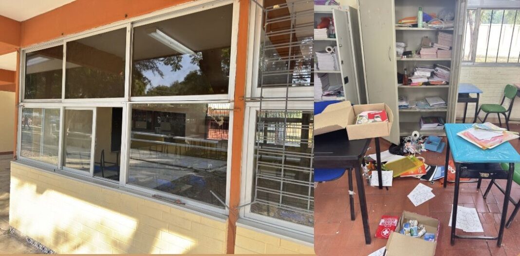 La institución, con turno matutino, amaneció este día con salones vandalizados y despojados de material educativo: desde plumones y material didáctico, hasta proyectores y equipo esencial para las actividades académicas.